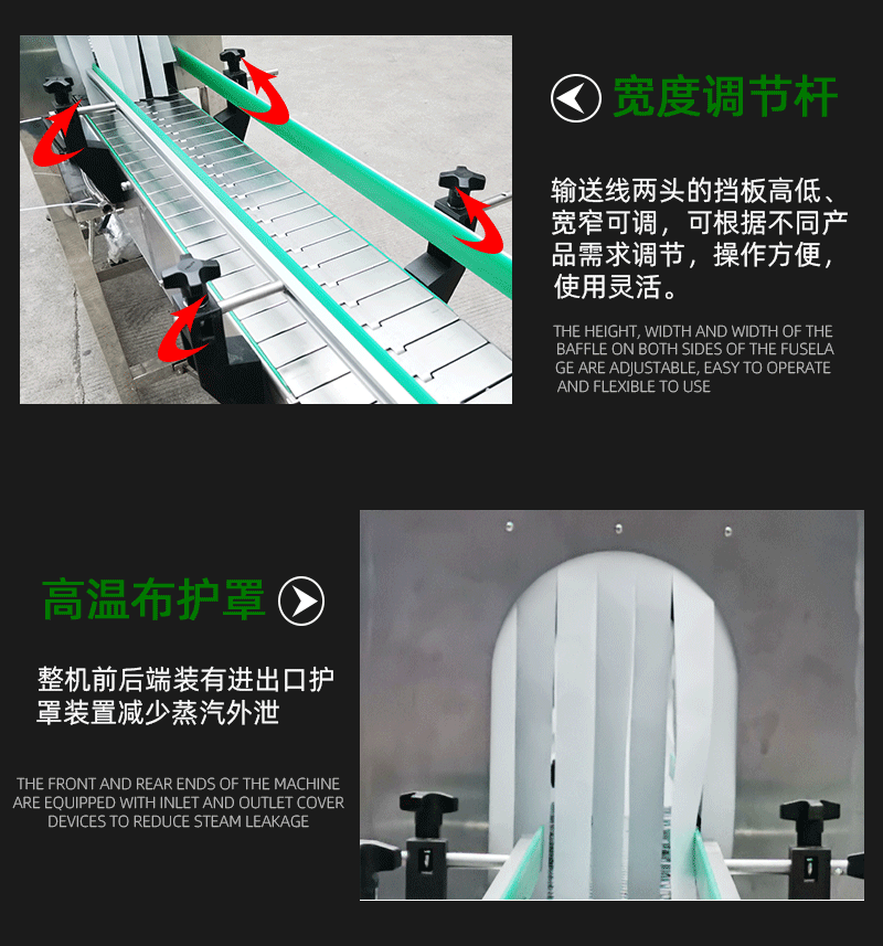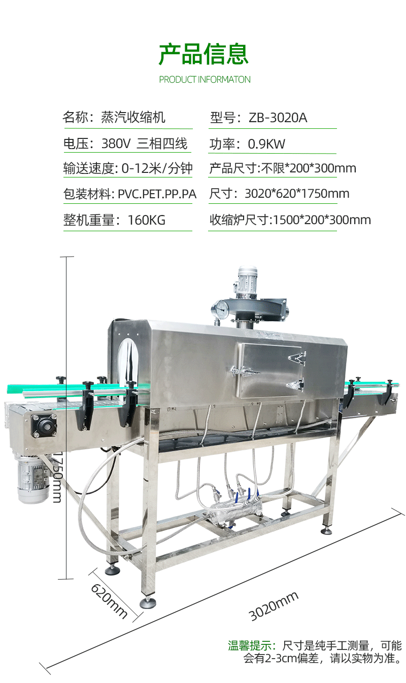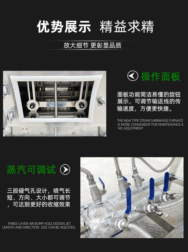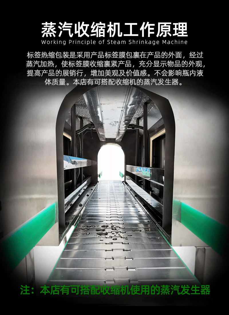 收縮階段:包裝好的產(chǎn)品接著被輸送到蒸汽收縮部分的收縮通道入口。此時(shí),蒸汽發(fā)生系統(tǒng)已經(jīng)產(chǎn)生了合適的蒸汽,蒸汽通過噴頭均勻地噴灑在產(chǎn)品的包裝薄膜上。包裝薄膜在蒸汽的熱量作用下開始收縮,緊密貼合在產(chǎn)品表面。產(chǎn)品在輸送系統(tǒng)的推動(dòng)下繼續(xù)在收縮通道內(nèi)移動(dòng),保證薄膜各個(gè)部分都能充分收縮。收縮完成后,通風(fēng)口排出蒸汽,產(chǎn)品在外界環(huán)境下冷卻定型,最終完成蒸汽收縮包裝,從出口輸送帶送出一體機(jī)。