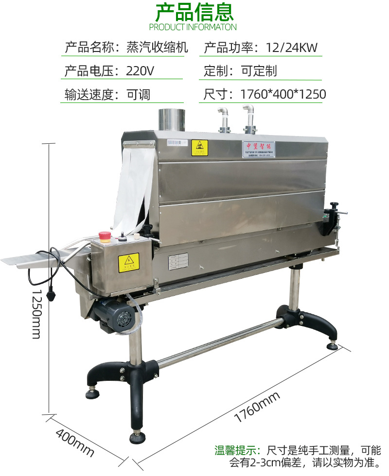 - 在食品飲料行業(yè)中,蒸汽收縮機(jī)被廣泛用于產(chǎn)品的外包裝收縮。例如,對(duì)瓶裝飲料、罐裝食品、禮盒裝食品等進(jìn)行薄膜包裝后,利用蒸汽收縮機(jī)使薄膜緊密貼合在產(chǎn)品和包裝盒上,不僅可以提高產(chǎn)品的外觀吸引力,還可以增強(qiáng)包裝的防潮、防塵等性能。