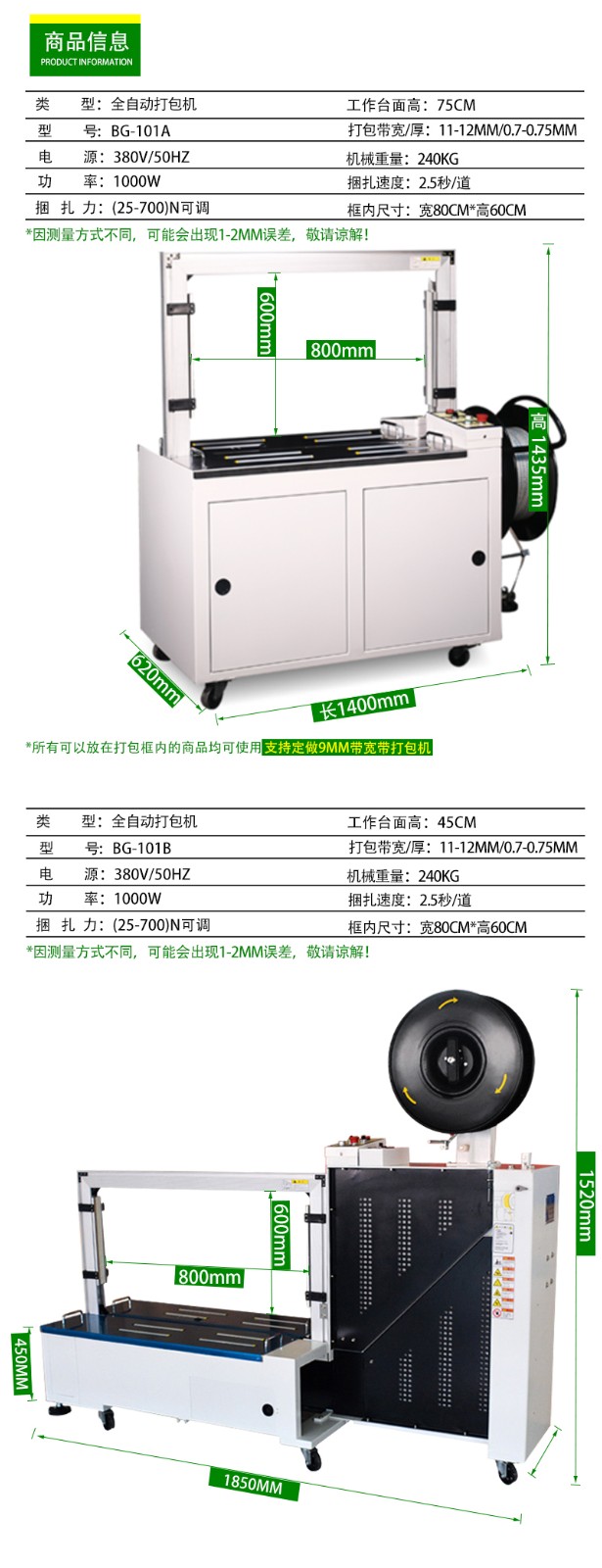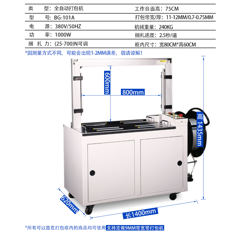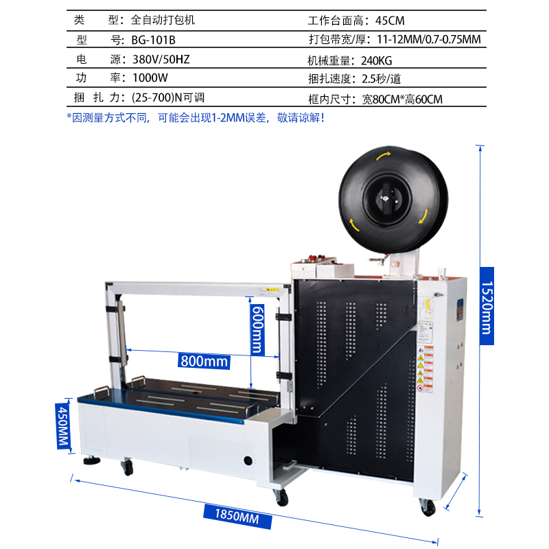 - 尺寸與形狀:如果物品尺寸較大、形狀不規(guī)則,需要選擇弓架尺寸大的打包機,如家電、家具等行業(yè),可能需要弓架寬度 800mm 以上、高度 600mm 以上的機型;對于小型物品,如快遞包裹、小型電子產(chǎn)品等,可選弓架尺寸較小的,如寬度 400-600mm、高度 300-400mm 的機型,方便精準打包且設(shè)備占地小。