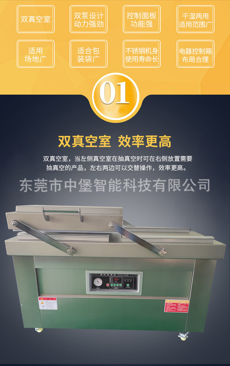 - 自動化程度:自動化程度高的雙室真空包裝機(jī),如配備自動上料、下料、分揀等功能,能減少人工操作時(shí)間,提高工作效率。