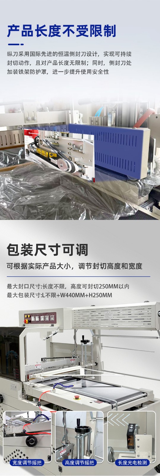 - 縱向高度:通過升降封切裝置或調(diào)整熱收縮隧道高度,適配 20-300mm 高的產(chǎn)品(如從包裝 5cm 高的便利貼到 25cm 高的桶裝零食);部分定制機型還可擴展尺寸范圍,滿足大型產(chǎn)品(如小型家電、工具箱)的包裝需求,進(jìn)一步拓寬適用邊界。