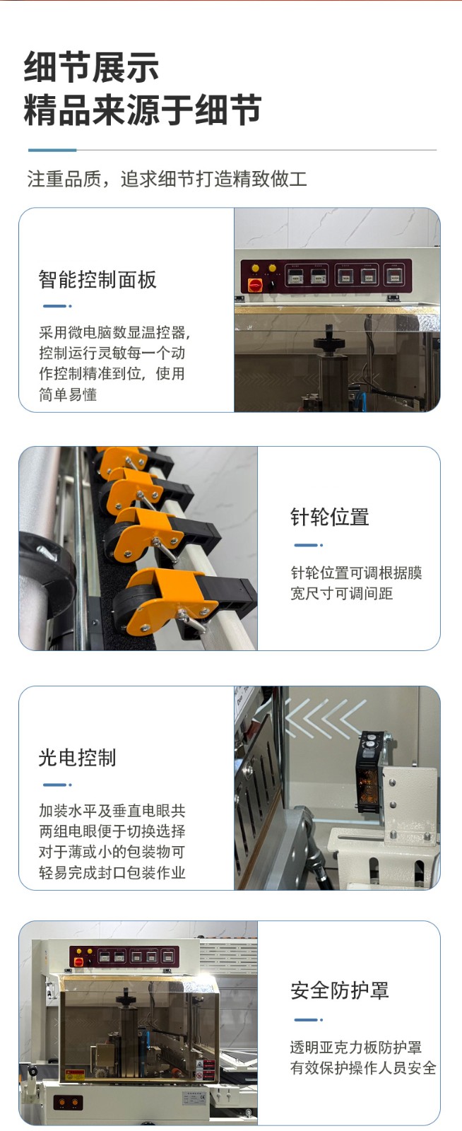自動化保護(hù)機制,保障運行穩(wěn)定性設(shè)備內(nèi)置多重智能保護(hù)功能:當(dāng)薄膜用盡時,機器會自動停機并報警;封切刀溫度異常(過高 / 過低)時,系統(tǒng)會實時監(jiān)測并觸發(fā)保護(hù),防止薄膜燙破或封合不牢固;進(jìn)料口無產(chǎn)品時,送膜與封切工序會同步暫停,避免空膜浪費。這些自動化保護(hù)不僅減少設(shè)備故障風(fēng)險,也降低了人工巡檢的頻率,提升設(shè)備連續(xù)運行的可靠性。