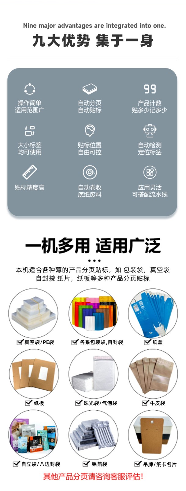廣泛的適用性:可處理寬度在 70 至 150 毫米之間,厚度在 0.2 至 5 毫米之間的產品,支持寬度在 20 至 100 毫米之間,長度在 50 至 300 毫米之間的標簽,適用于多種材質的產品,如塑料袋、卡片、紙張、紙盒等。