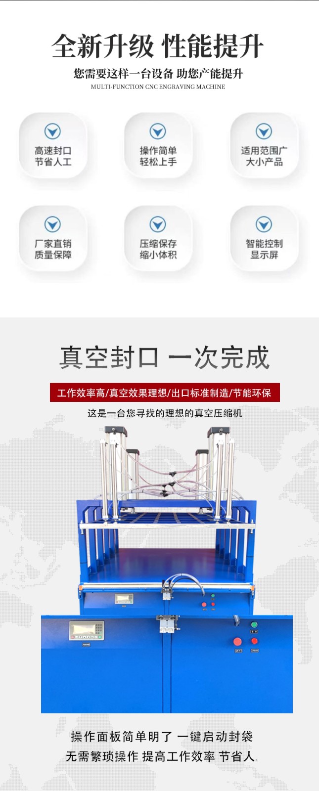 真空壓縮封口機是一種用于將物品進行真空包裝并封口的設備,能有效延長物品保質期、減小包裝體積,廣泛應用于食品、家紡、電子等多個行業(yè)不同型號的真空壓縮封口機操作略有差異,但一般步驟如下:首先將待包裝物品放入包裝袋,整理好袋口;然后將袋口放入封口機的密封槽內,若為外抽式,需將抽氣嘴拉出套入包裝袋;接著按下抽真空按鈕,開始抽氣,達到所需真空度后,抽氣嘴縮回(部分機型自動完成);最后再次按下相關按鈕進行封口操作,冷卻后即可取出包裝好的物品。延長保質期的核心邏輯