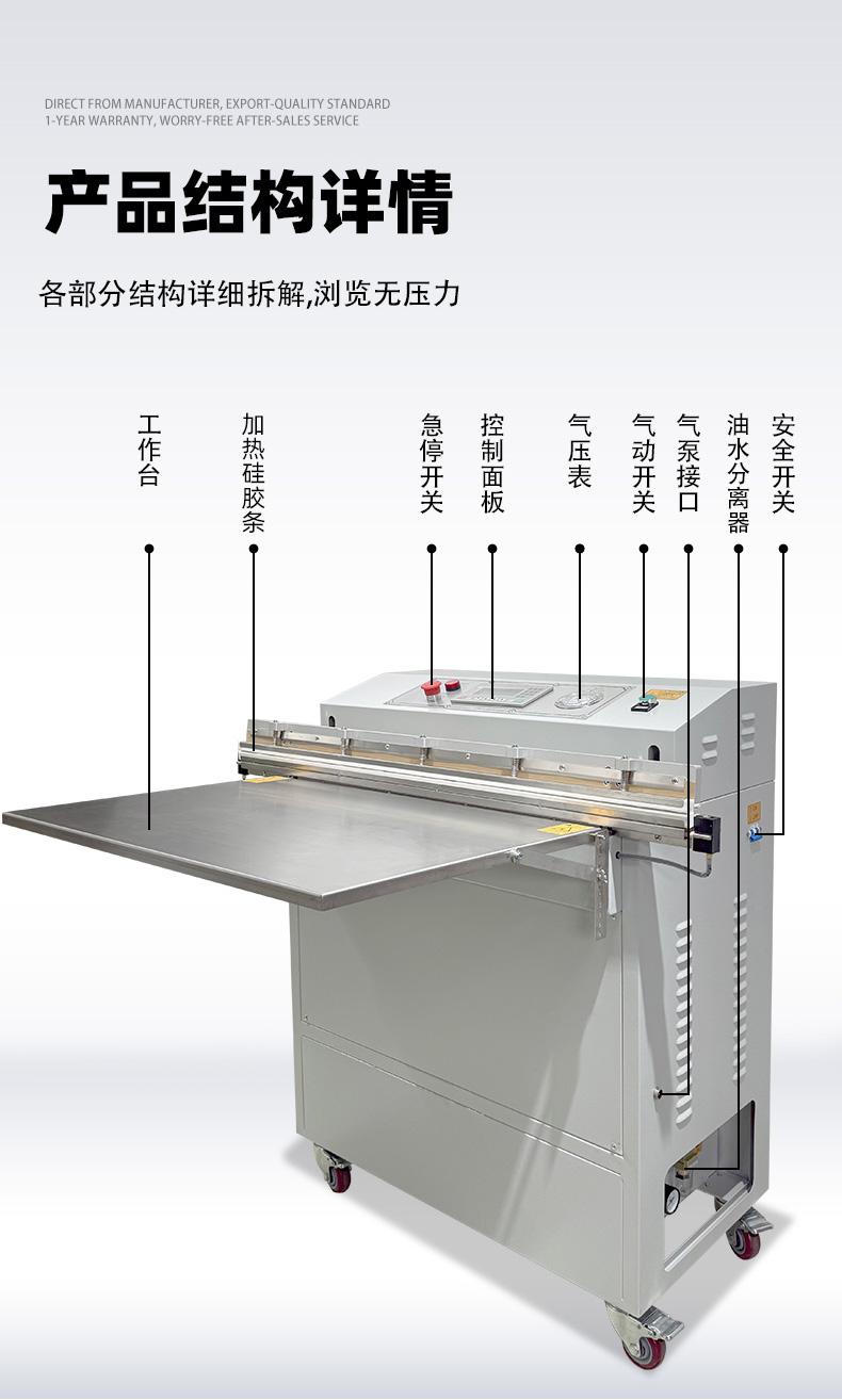 - 工業(yè)領域:可真空包裝大型機械零件(防銹)、整箱電子元件(防塵),部分機型支持調節(jié)抽真空力度,避免損壞精密組件。