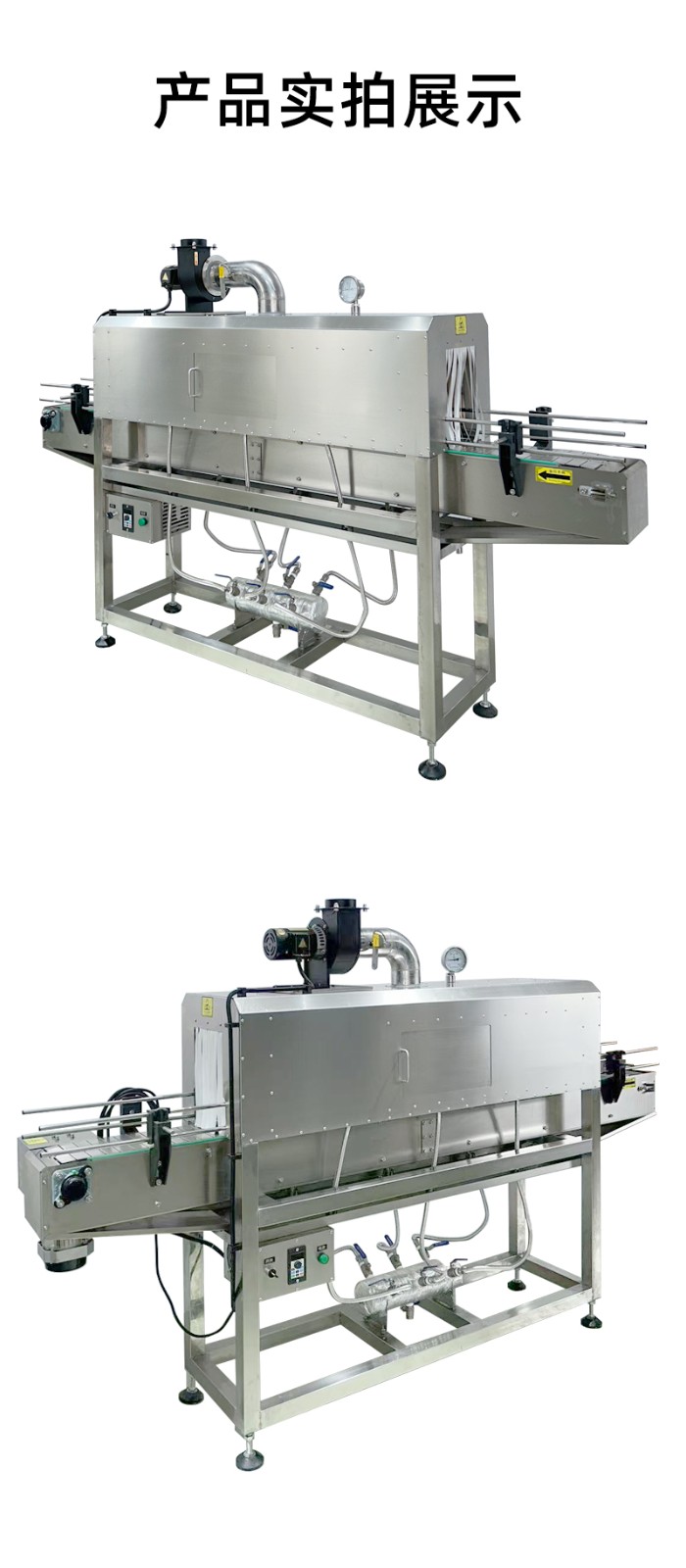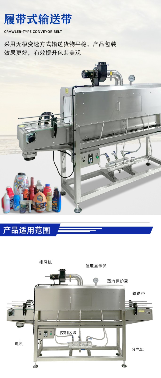 - 完成收縮的產(chǎn)品繼續(xù)在通道內(nèi)移動(dòng),通道末端的通風(fēng)裝置會(huì)排出多余蒸汽,并對(duì)產(chǎn)品進(jìn)行快速冷卻。