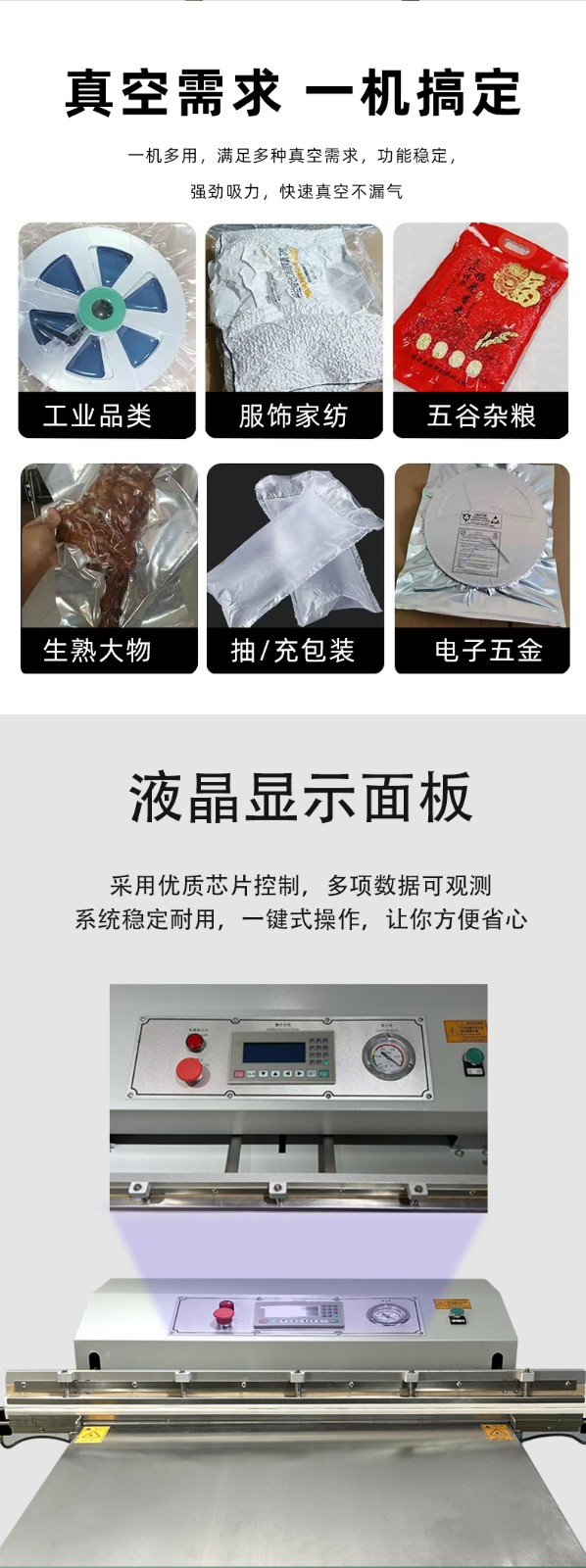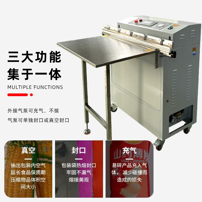 外抽真空包裝機不受包裝容器形狀和尺寸限制,無論是大型工業(yè)零部件還是小型家用物品,只要抽氣口能與抽氣嘴連接,均可進行真空包裝