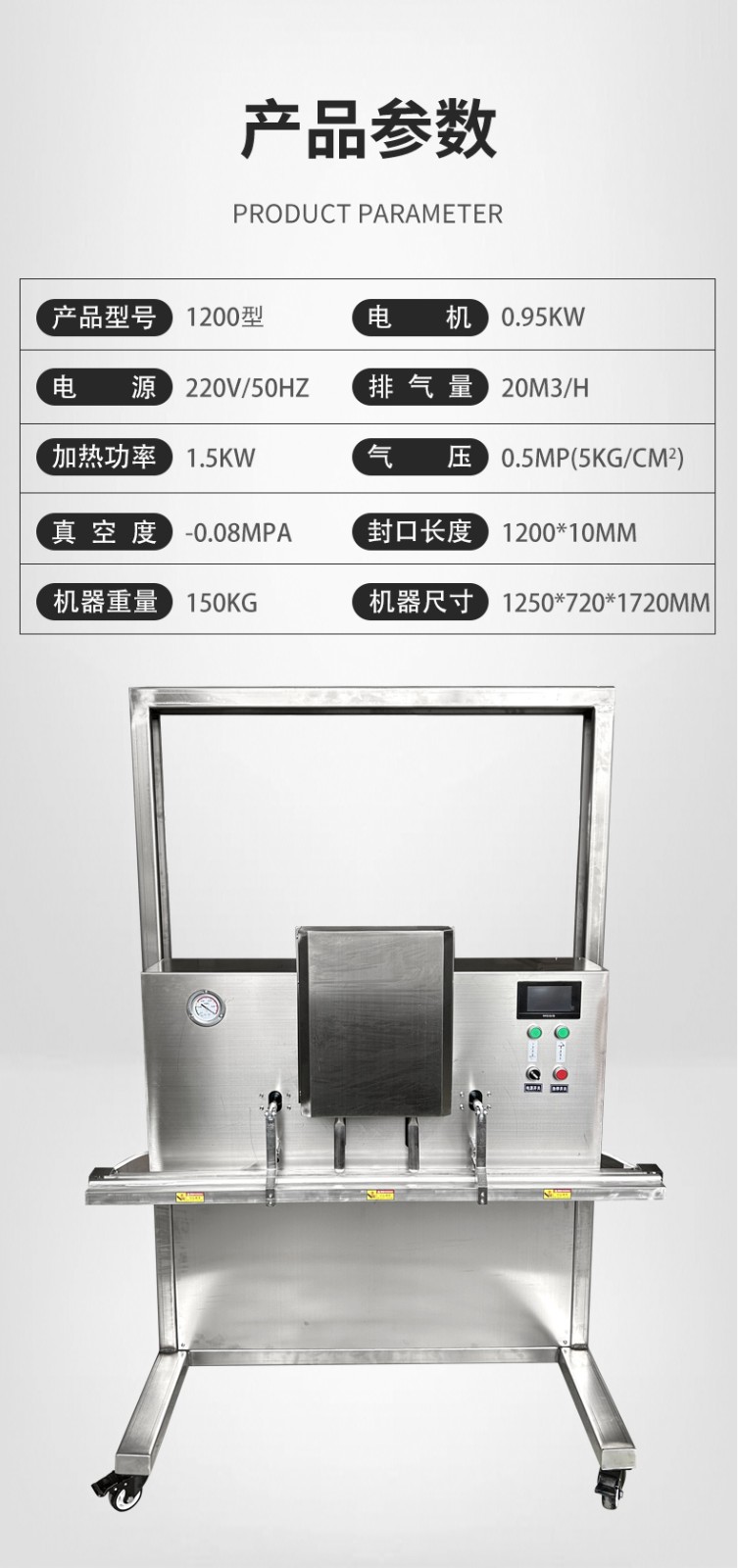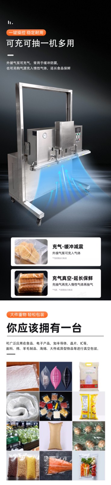 可定制與多模式適配不同尺寸:部分機型支持封口規(guī)格定制,封口長度可達到 800mm、1000mm 甚至 1200mm 等,適配不同寬度的包裝袋。同時,部分先進機型預(yù)設(shè)多組工作模式,可快速切換真空、充氣、封口等流程,適配從小袋糕點到大袋五金模具等不同尺寸、類型產(chǎn)品的包裝需求。