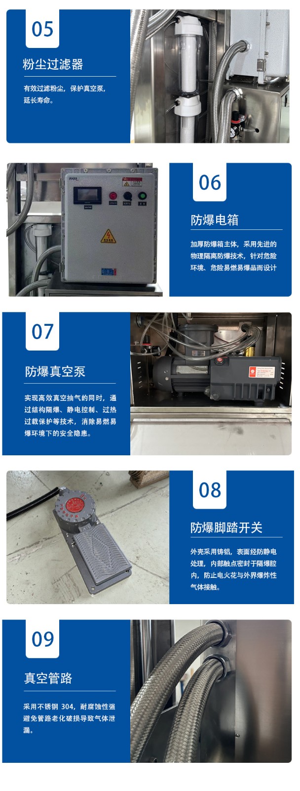 - 密封與過濾部件:機頭柜和電柜均采用全密封設計并加裝密封膠條,防止易燃易爆氣體、粉塵進入內(nèi)部損壞元件或引發(fā)短路;關(guān)鍵的抽氣口、真空室等采用 304 不銹鋼材質(zhì),部分機型還配有 40mm 厚的有機玻璃透明觀察窗,既保障防爆性能又便于觀察包裝過程;同時加裝粉末隔離和過濾裝置,防止包裝物料中的粉塵堵塞真空泵,避免設備故障導致的安全問題。