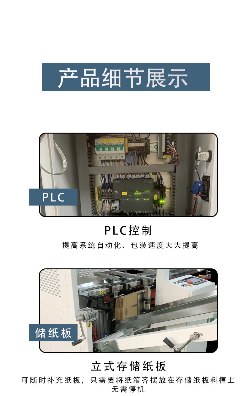 - 自動化程度高:一次完成紙箱吸箱、開箱、成型、折底、封底等包裝工序,可大大減少生產(chǎn)人員和勞動強度。