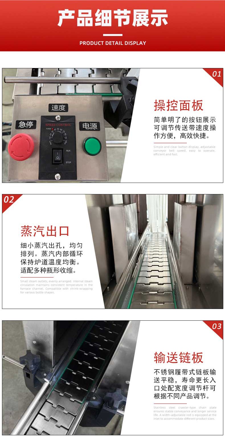 - 輸送帶:用于輸送待包裝的產(chǎn)品,將產(chǎn)品依次送入蒸汽收縮區(qū)域進(jìn)行包裝作業(yè),其速度可無(wú)級(jí)調(diào)節(jié),以適應(yīng)不同的生產(chǎn)節(jié)奏 1。