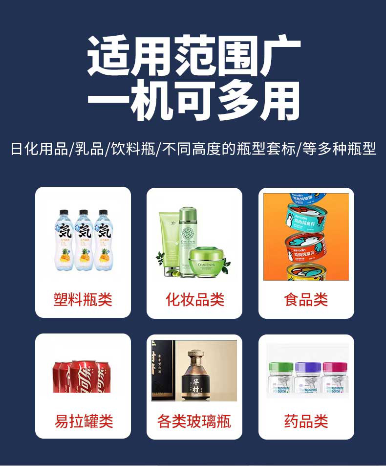 - 適用范圍廣:可適用于各種形狀、尺寸的產(chǎn)品包裝,包括不規(guī)則形狀的產(chǎn)品,如不同及不規(guī)則圓瓶、方瓶、扁瓶等瓶形 1。