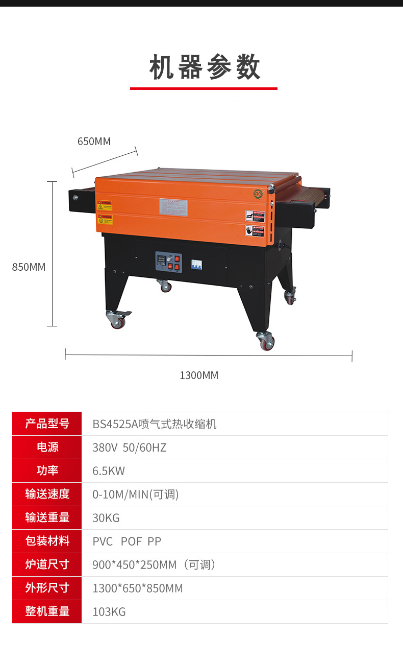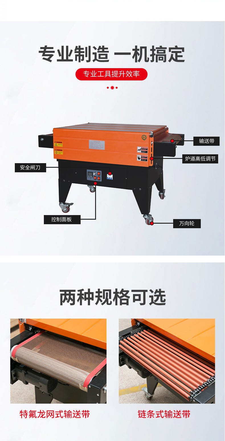 - 收縮溫度范圍:一般為 120 - 200℃。不同的熱收縮薄膜有不同的最佳收縮溫度,在選型時要考慮機(jī)器的溫度范圍是否能夠滿足所使用薄膜的要求。例如,PVC 薄膜的收縮溫度一般在 140 - 160℃,POF 薄膜的收縮溫度約為 160 - 180℃。