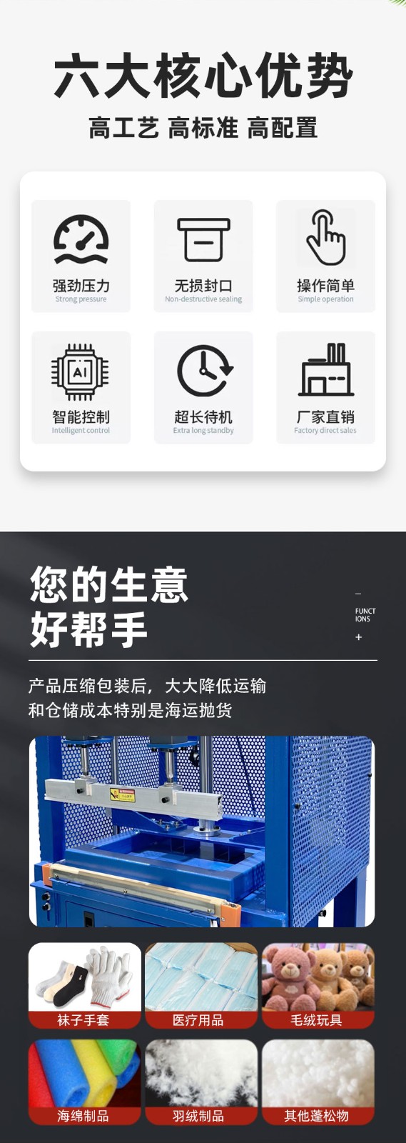 壓縮封口包裝機(jī)是一種用于對(duì)產(chǎn)品進(jìn)行壓縮和封口包裝的設(shè)備,以下為你詳細(xì)介紹: