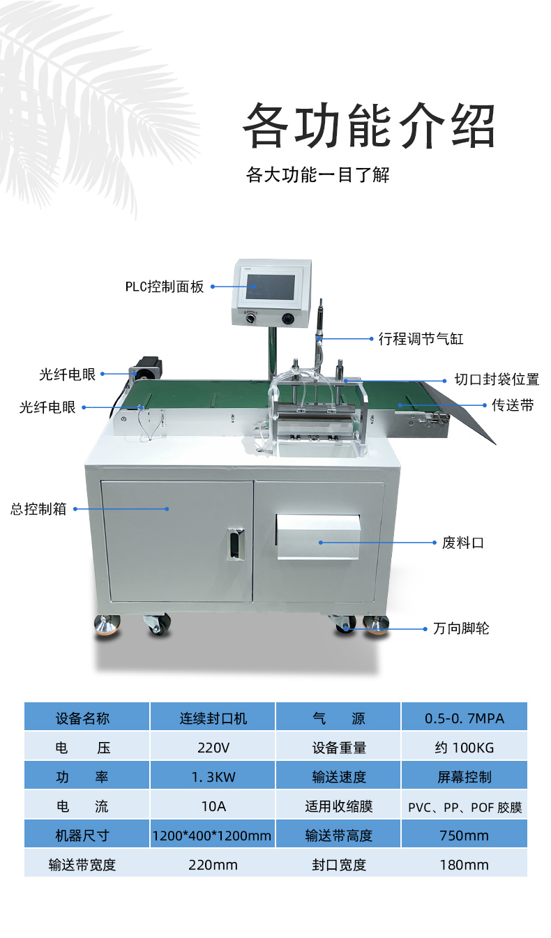 - 連續(xù)式氣動(dòng)封切機(jī)整體結(jié)構(gòu)較為緊湊,通常由機(jī)身框架、封切機(jī)構(gòu)、輸送機(jī)構(gòu)、控制系統(tǒng)操作面板以及防護(hù)裝置等部分組成。機(jī)身框架采用堅(jiān)固的金屬材料制成,能夠穩(wěn)定支撐各部件并承受一定的工作負(fù)荷。封切機(jī)構(gòu)位于機(jī)器的上方或特定工作區(qū)域,包含氣動(dòng)缸、封切刀等關(guān)鍵部件,氣動(dòng)缸通過連接部件與封切刀相連,以提供動(dòng)力實(shí)現(xiàn)封切動(dòng)作。輸送機(jī)構(gòu)貫穿機(jī)器,由輸送帶、驅(qū)動(dòng)滾筒、電機(jī)等組成,輸送帶一般采用耐磨、耐高溫的材料制成,可根據(jù)不同的包裝需求選擇合適的寬度和長(zhǎng)度??刂葡到y(tǒng)操作面板通常安裝在機(jī)器的側(cè)面或便于操作的位置,上面設(shè)有各種按鈕、旋鈕和顯示屏,用于設(shè)置封切參數(shù)、控制機(jī)器運(yùn)行狀態(tài)等。防護(hù)裝置則安裝在機(jī)器的危險(xiǎn)區(qū)域周圍,如封切刀附近,以防止操作人員意外接觸到運(yùn)動(dòng)部件或高溫部件,保障人員安全。