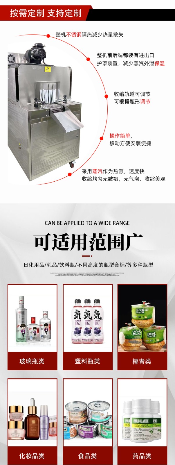 - 食品飲料行業(yè):用于瓶裝飲料、易拉罐、醬料瓶的標(biāo)簽收縮,蒸汽加熱能避免高溫破壞食品,同時標(biāo)簽貼合度高,提升產(chǎn)品外觀檔次。