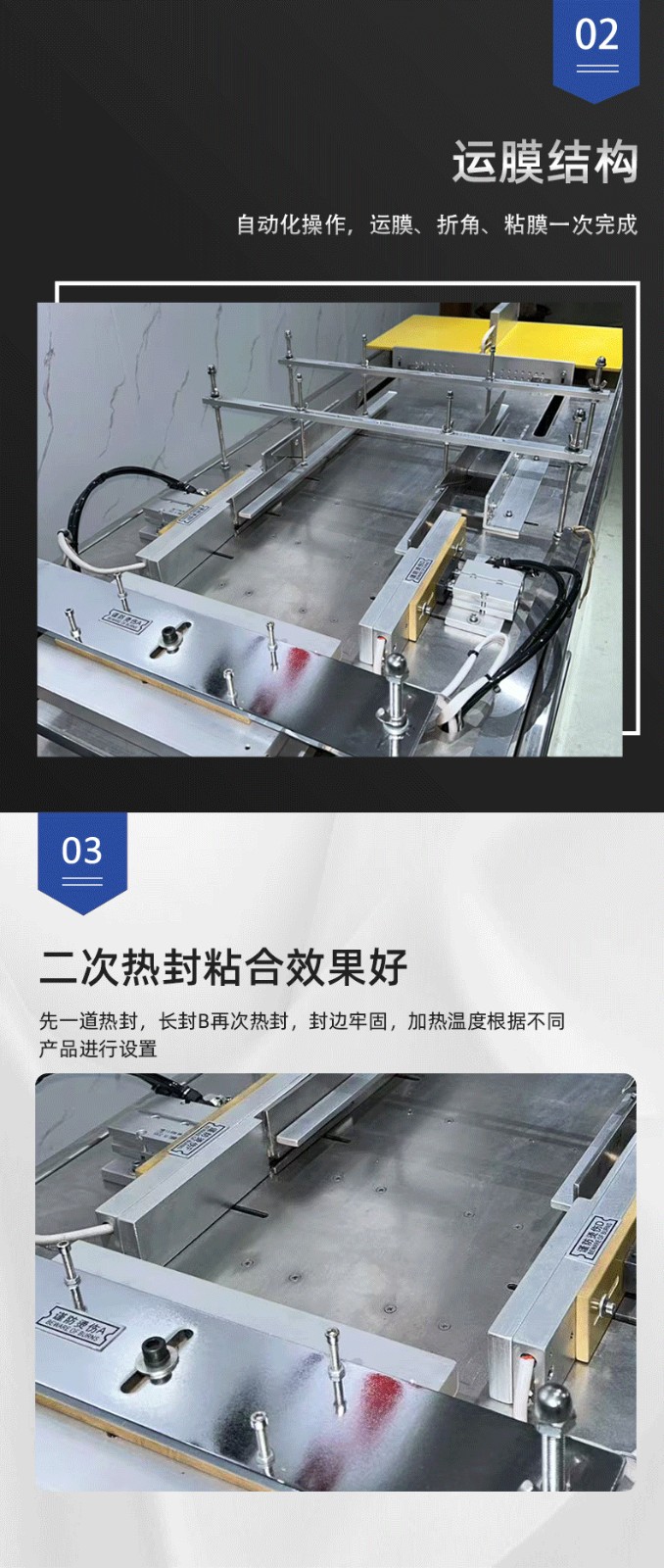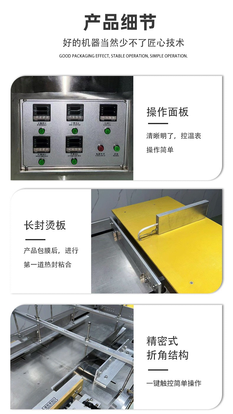 設(shè)備通過 “膜料預(yù)處理→人工上料定位→三維裹膜成型→熱封切邊→折邊定型→成品輸出” 的流程,實(shí)現(xiàn)產(chǎn)品的立體包裝,具體步驟拆解如下: