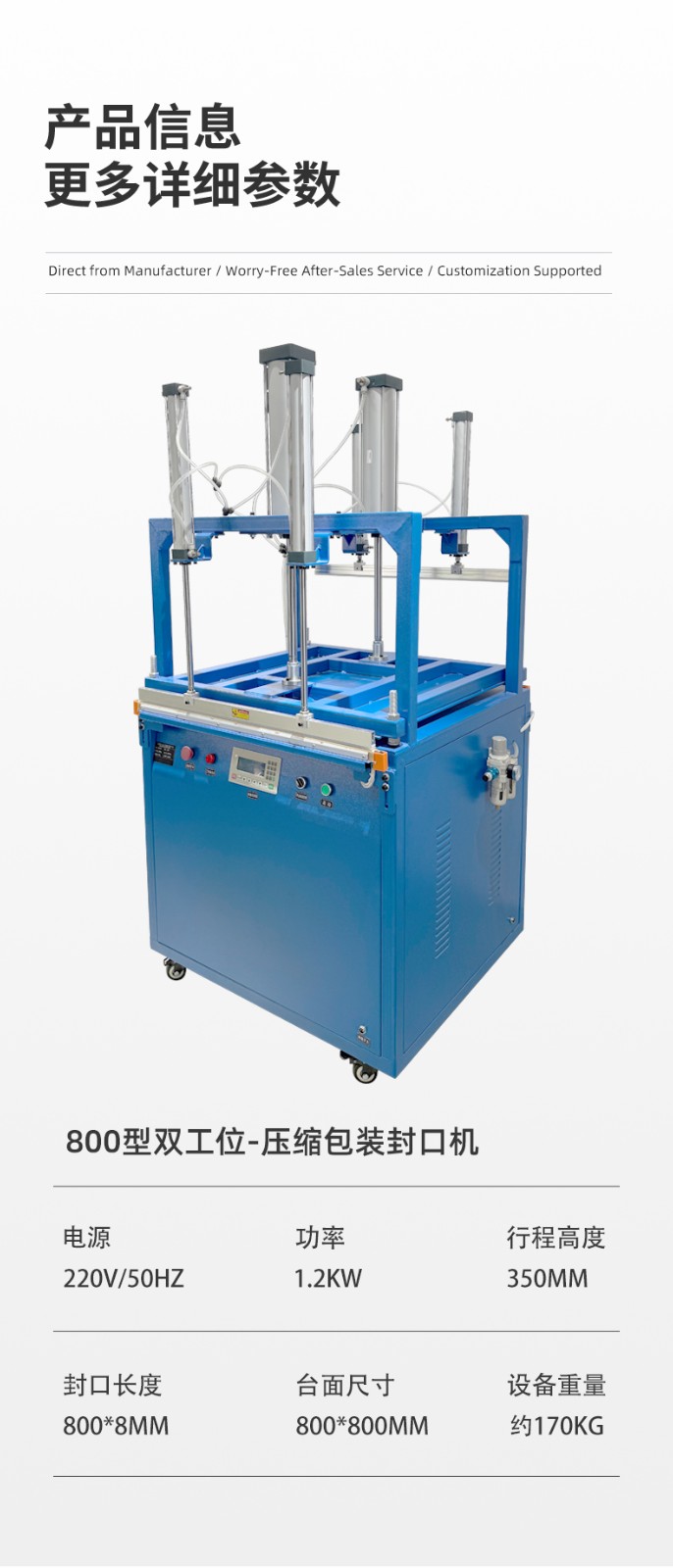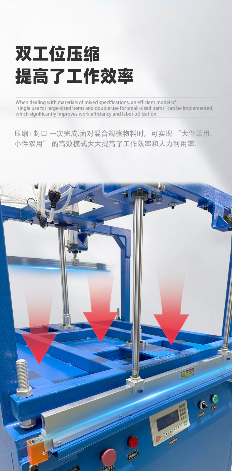 雙工位壓縮封口機:兩個工位可同時作業(yè),一邊封口時另一個可放件 / 取件,適合中小批量、多規(guī)格產品(如多口味食品、電子元件袋),效率比單工位高 50%-80%。